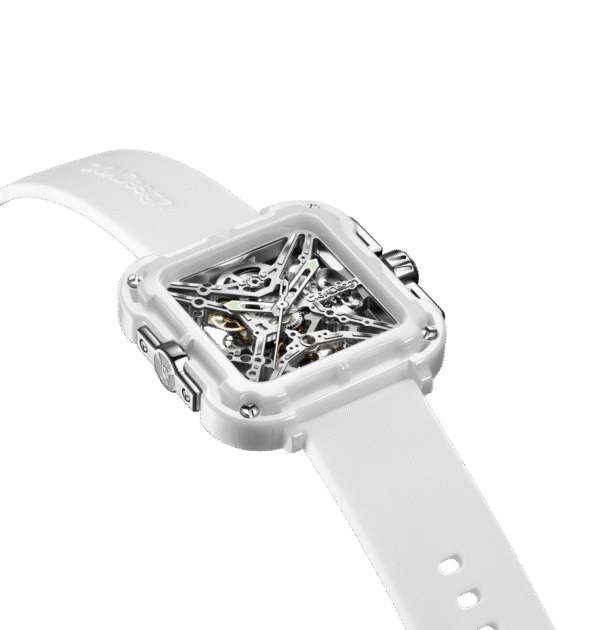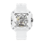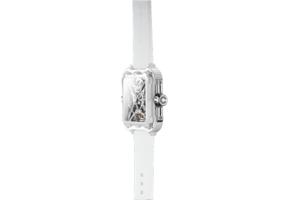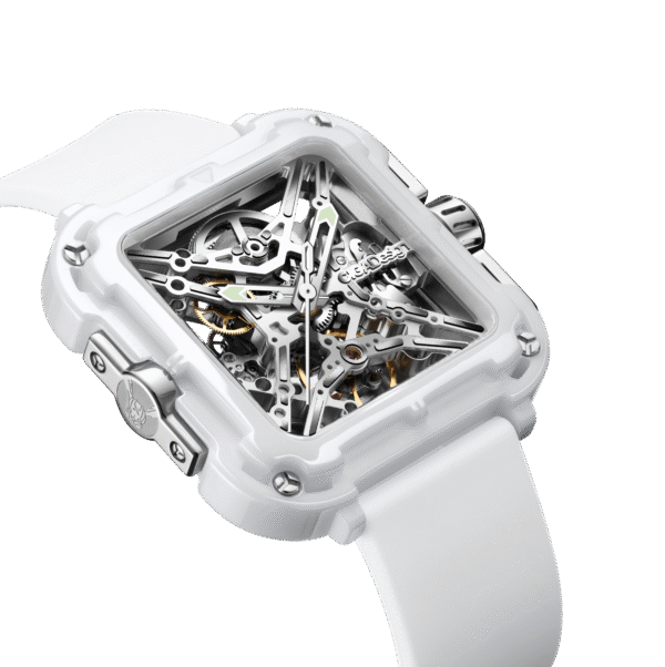 | Back-to-front Transparent Skeleton with Details Iconic X-Shaped Baseplate Enclosed by Four Triangles Subtle Glints on Reflective Modules of the Bridges Sleek Ceramic Case with Silky Touch and Diverse Tints Edges Cut on Bezel for Unique Time-Telling |